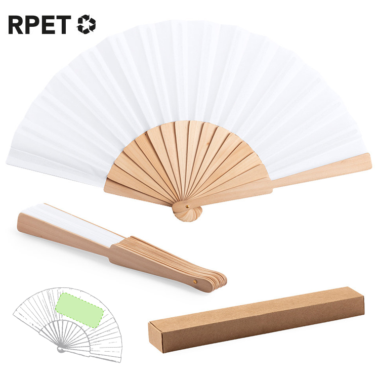 Abanico de lÃnea nature, con varillas de madera y tela en RPET, elaborado a partir de plástico reciclado, para asà fomentar la reutilización de residuos plásticos y ayudar a la sostenibilidad del planeta. Presentado en caja individual de diseño eco.