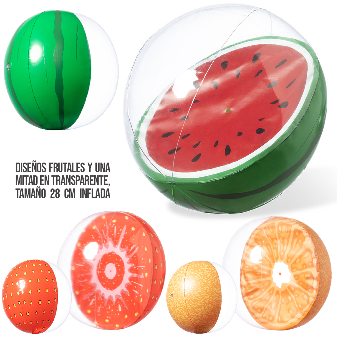 Balón de playa inflable con diseños frutales. Fabricado en resistente PVC y una mitad en transparente. Medidas Desinflado: 37 cm. Inflado: 28 cm