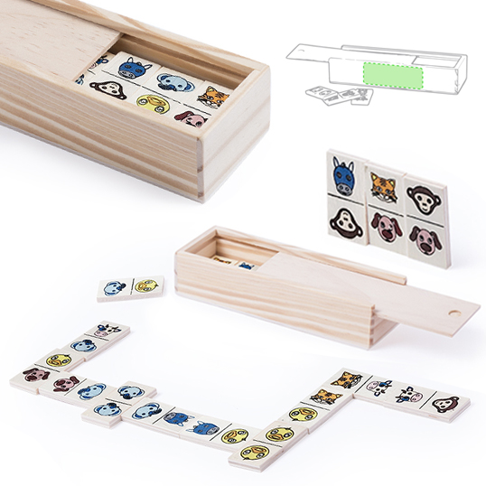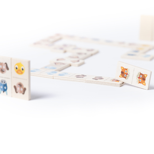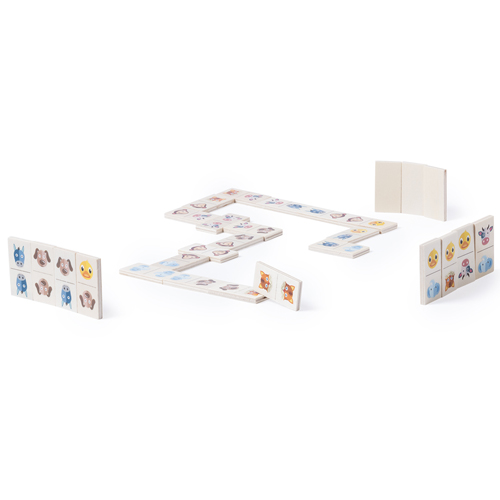 Divertido dominĂ³ de animalitos en madera. Con 28 piezas de madera y presentado en estuche de madera con tapa. 28 Piezas
