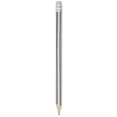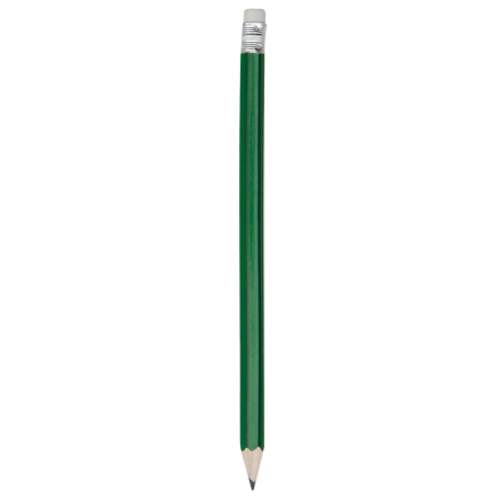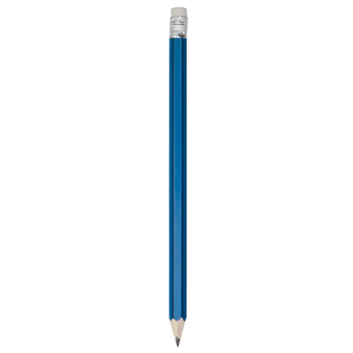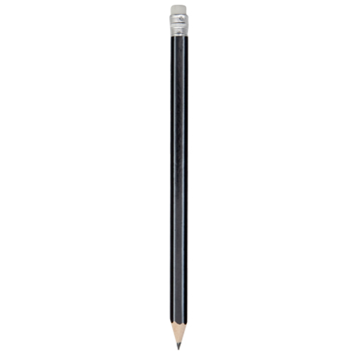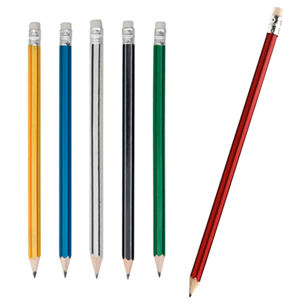 Lápiz de madera de acabado brillo. Cuerpo hexagonal y diseño bicolor, con goma de borrar en color blanco. Disponible en variada gama de colores, con mina negra y punta afilada.
